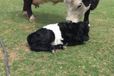 Belted Galloway, Miniature Hereford, and Lowline Black Angus cross